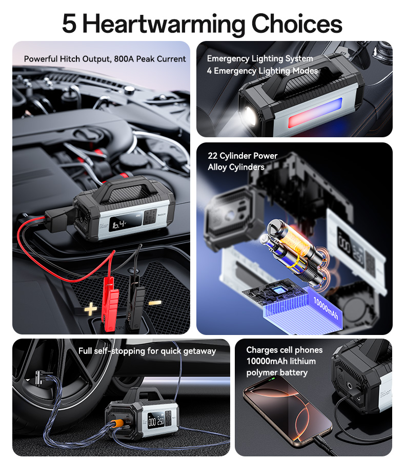 Multi-function design: jump starter, inflator, power bank, and flashlight